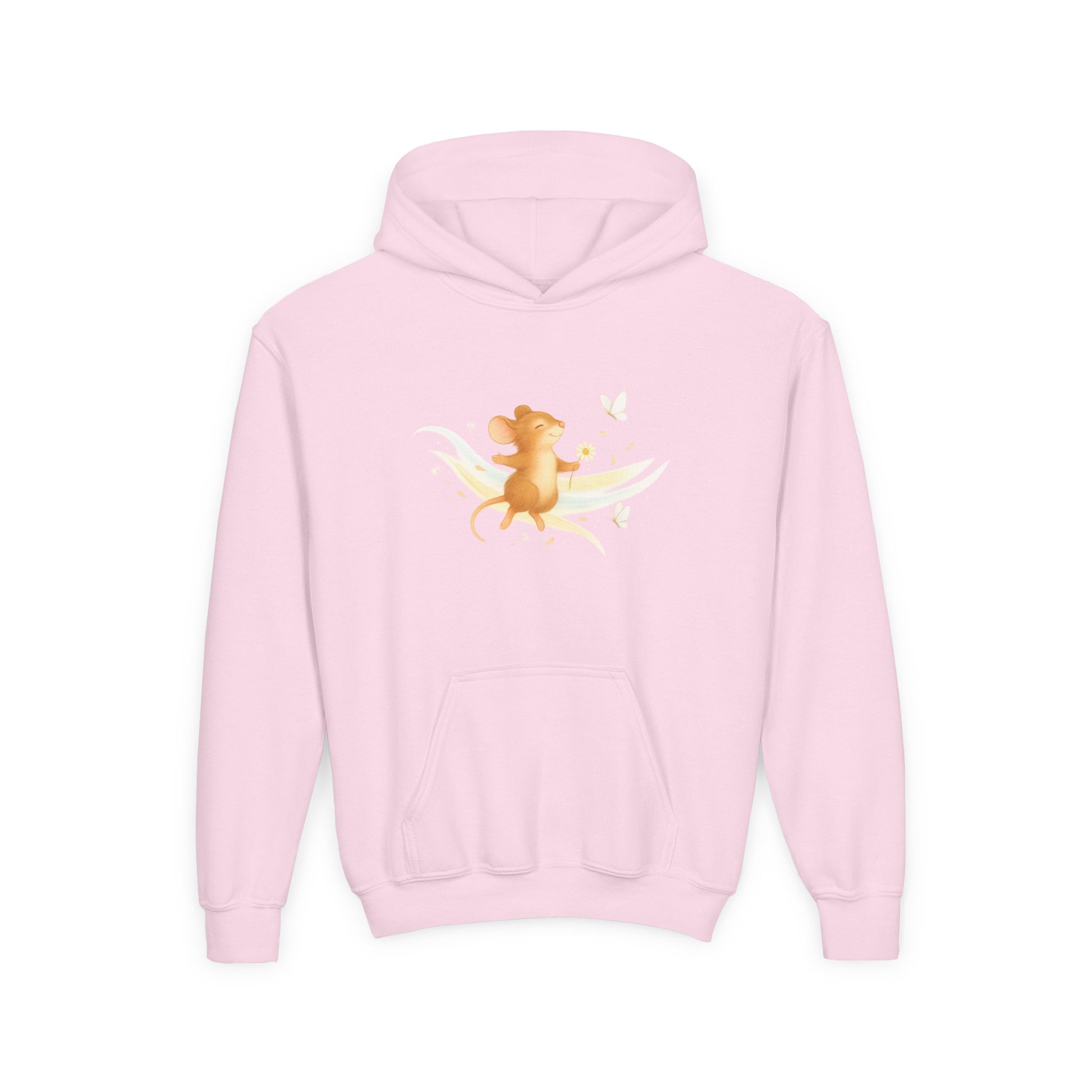 Dieser Kapuzenpullover erzählt eine kleine Geschichte: Die kleine Waldmaus Mimi lässt sich vom Wind sanft tragen – umgeben von Schmetterlingen, Blütenblättern und einem Hauch von Magie. Das Motiv wurde im liebevollen Aquarell-Stil gestaltet und wirkt wie ein kleines Märchen auf Stoff.